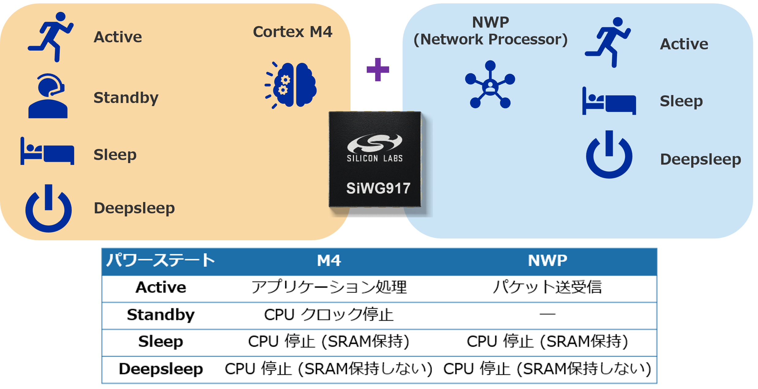 M4 Processorも多彩なパワーステートを搭載しており、M4 ProcessorとNWPのパワーステートの組み合わせにより、常に必要最低限の消費電力でアプリケーションを実行することが可能です。