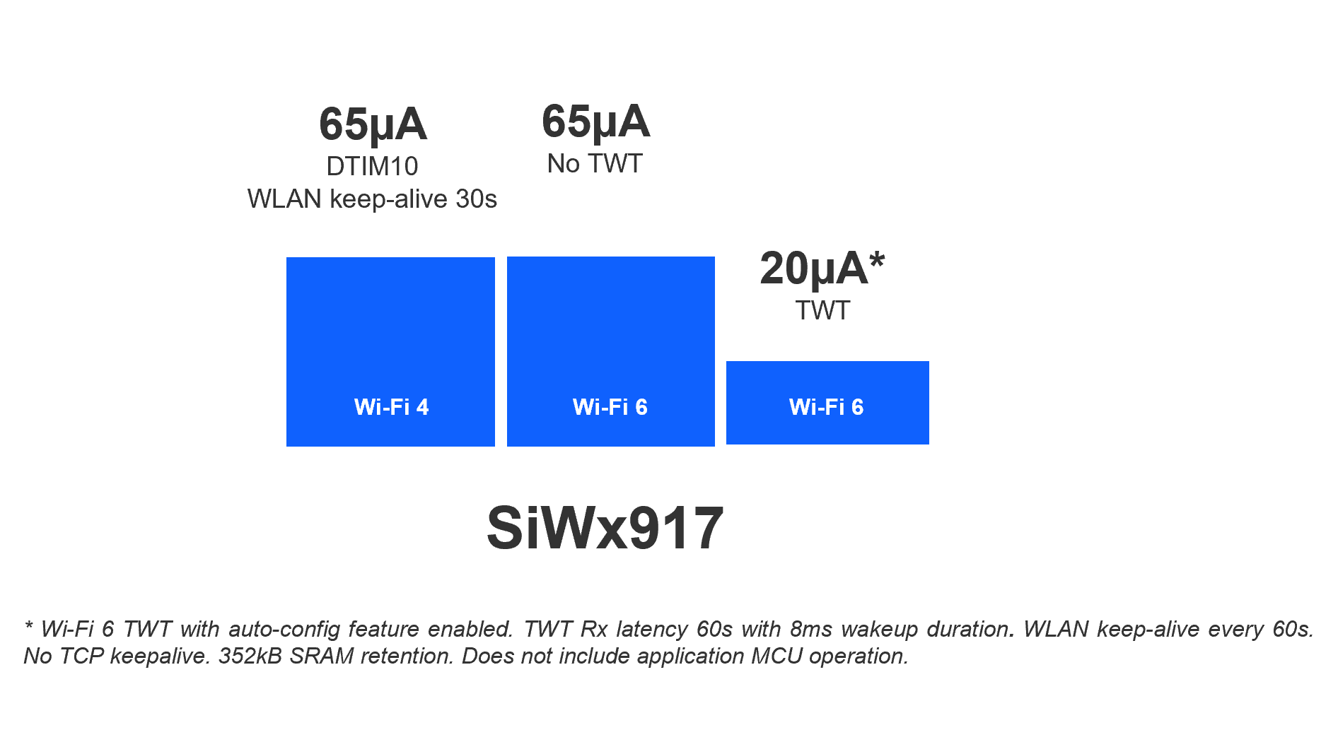 * 条件:Wi-Fi 6 TWT(オート設定)、TWT Rx latency 60秒、ウェイクアップ時間 8ms、WLANキープアライブ 60秒毎、TCP キープアライブ無し、352kB SRAM保持、MCUアプリケーション動作含まず。