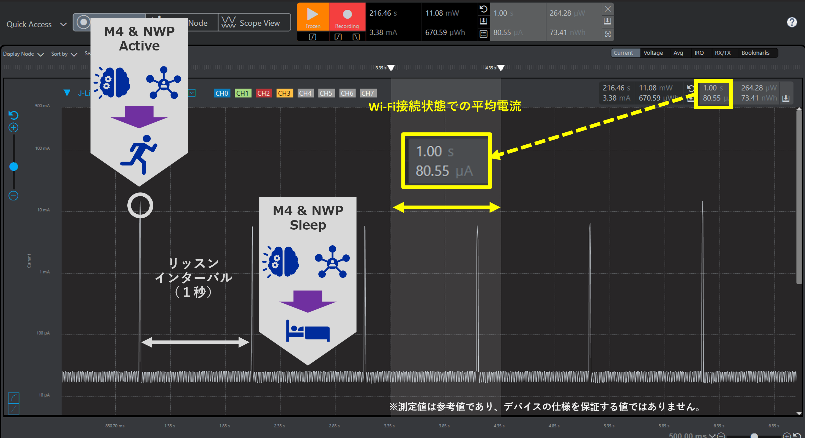 NWPは間欠動作によりパケットの送受信を行うことで、Wi-Fi 接続を維持したまま周期的にスリープすることが可能です。