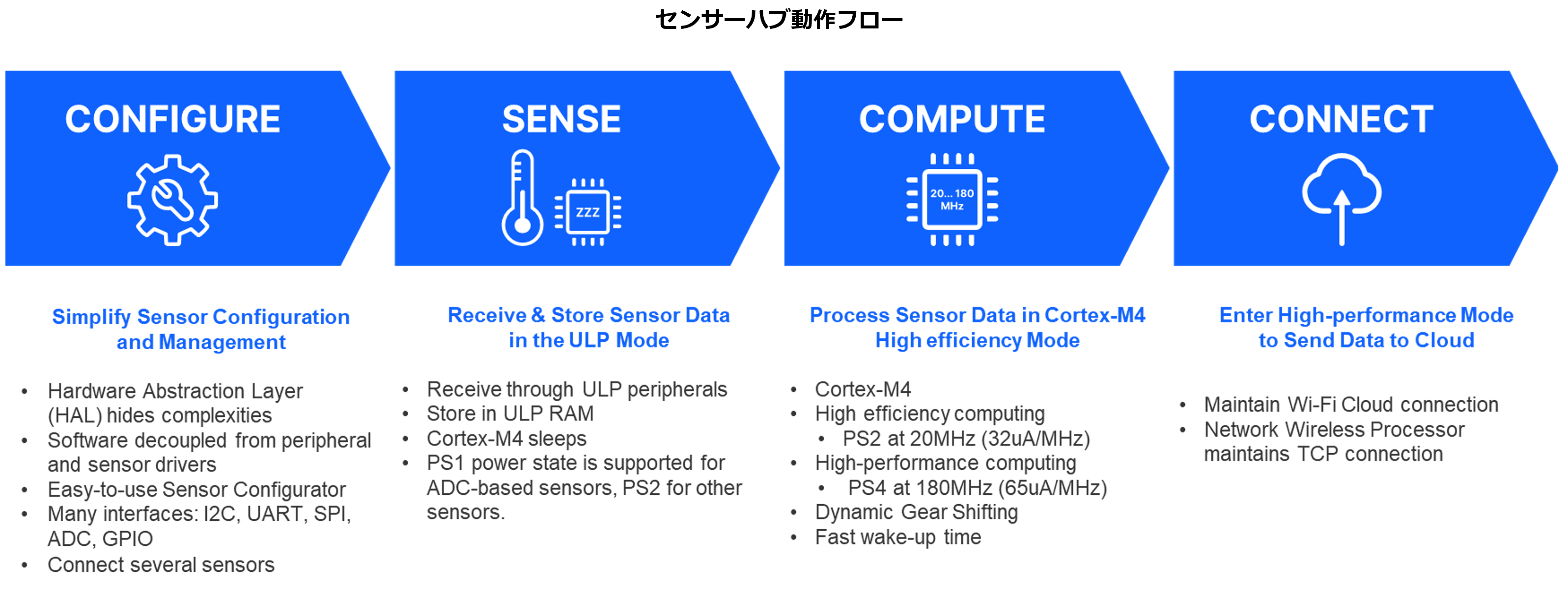 様々なセンサーから取得した信号を短時間で処理し、処理した情報を無線送信して再びスリープモードに移行するセンサーハブとしての動作が可能です。