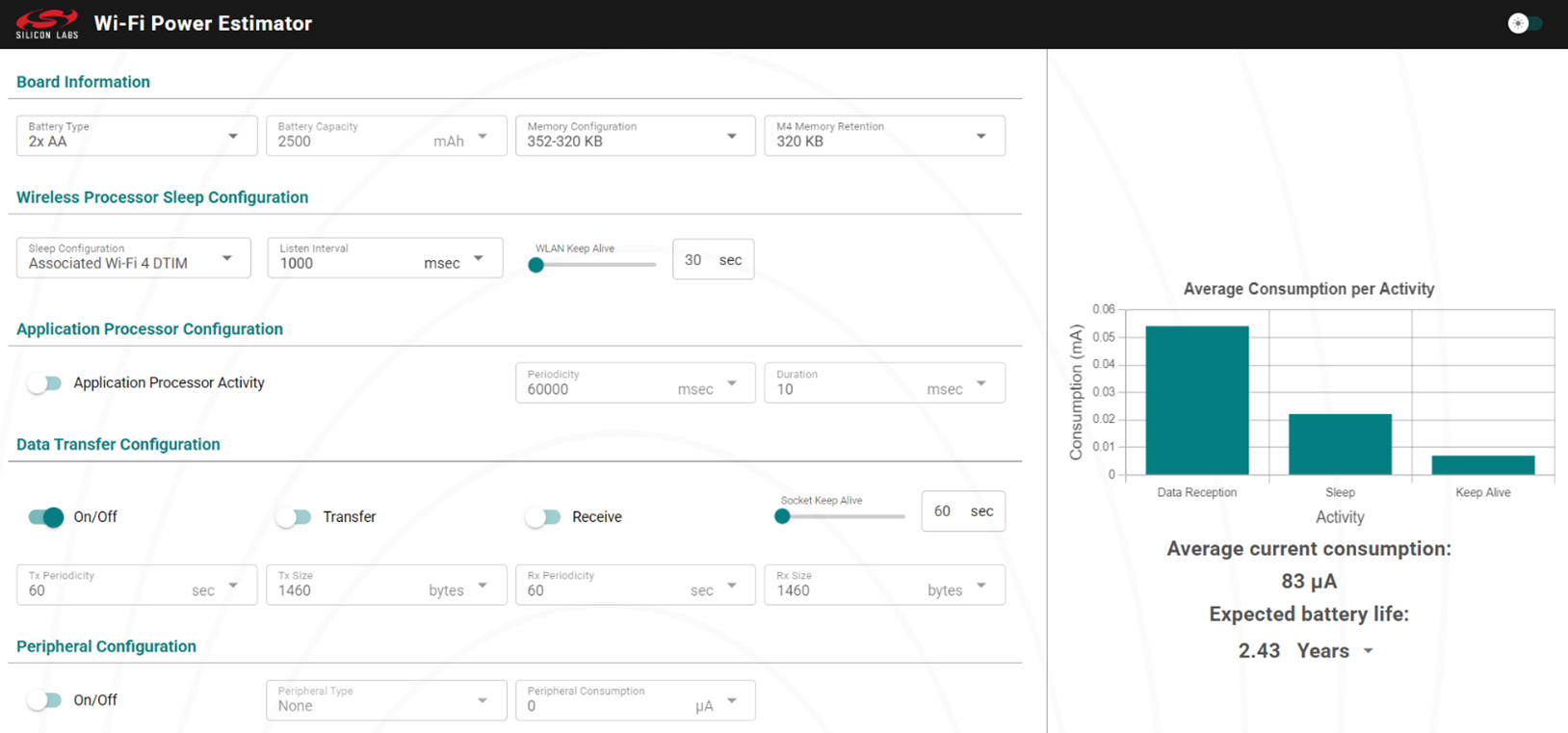 シリコン・ラボが提供する消費電力簡易見積ツール Wi-Fi Power Estimator