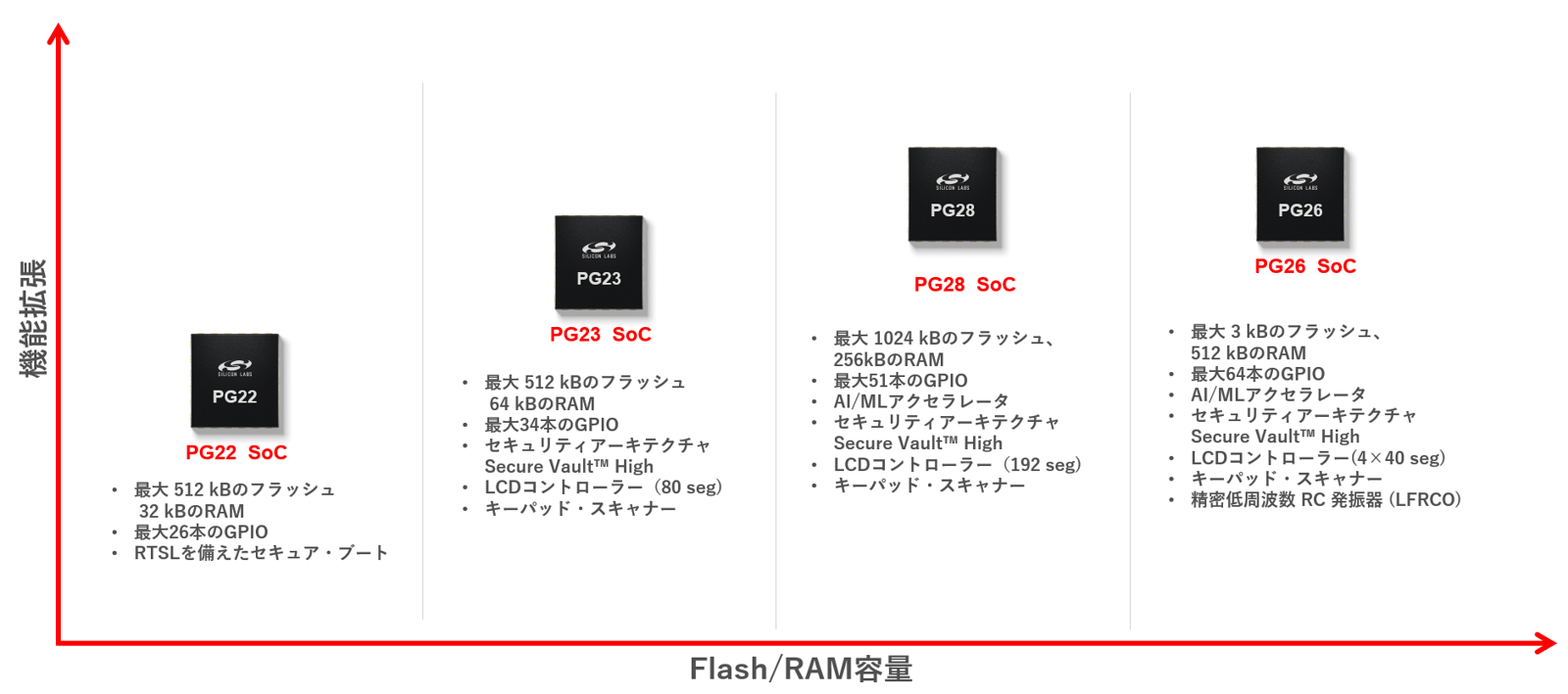 シリコン・ラボ社の汎用マイコン(MCU)製品であるEFM32シリーズのポートフォリオは、多様な方式をカバーする無線マイコン製品EFR32シリーズと基本実装を共通とした構成がとられており、同じペリフェラルを搭載した近しい実装の製品をスケーラブルな選択肢から選定していただくことが可能です。