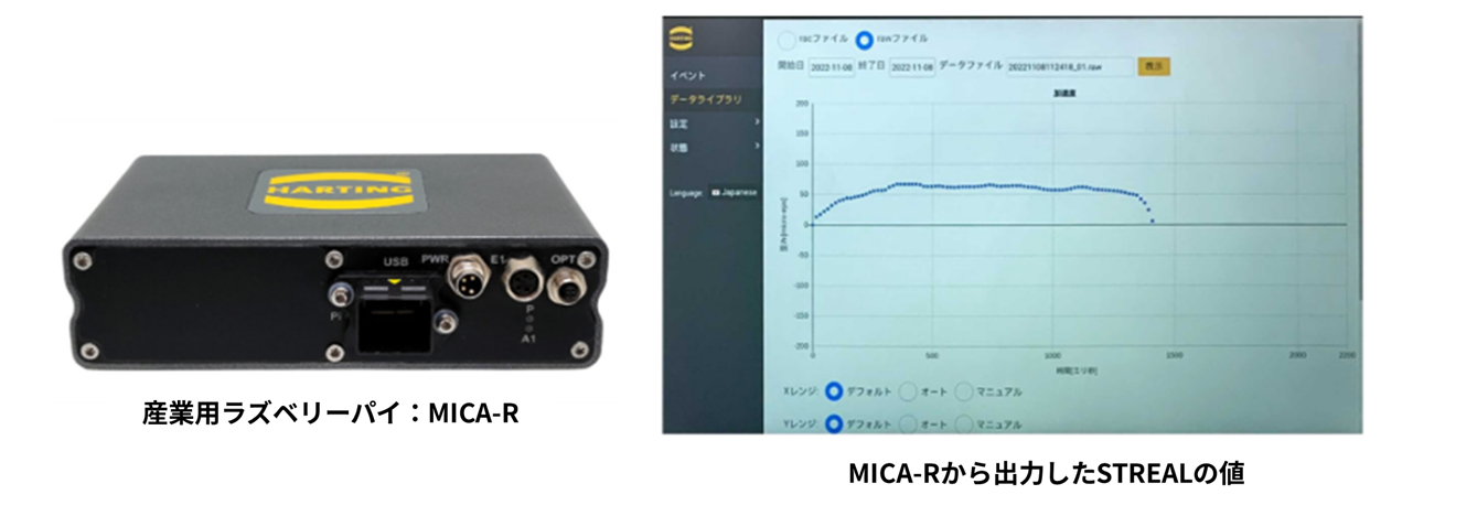写真はハーティング製産業用ラズベリーパイ(MICA-R)および920MHz サブギガ帯無線モジュールを活用し、マクニカ製のSTREALでセンシングしたデータを無線送信するデモの様子です。これにより設備の故障兆候等を無線で監視することができます。MICA-Rは産業用途に多数の実績を持ち、各センサーと接続したセンシングだけでなく、CODESYS®活用によるPLC連携や、USBビジョンカメラと接続した画像処理なども可能です。