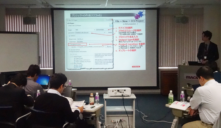 マイコン開発経験があり、かつ、MSP430開発をされる方を対象としていますので、セミナーのほとんどは演習です。このためMSP430に特化した、より実践的な使い方を短時間で学ぶことができます。