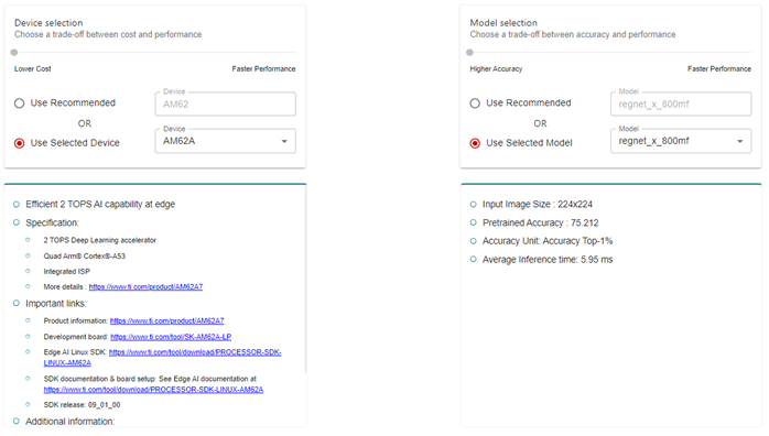 - Model Analyzer…手元にエッジデバイスが無くとも、TI社の評価ボードを使用したパフォーマンステストを行うことができます。