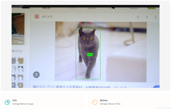 その後、GUI左上の“Start Live Viewing”ボタンを押すことで、EVMへのモデルの書き込みが開始され、カメラに入力された情報に対して推論を実行する事ができます。