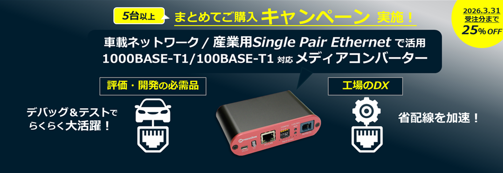 車載ネットワークや産業用Single Pair Ethernet (SPE)のための“評価・開発”に欠かせない “1000BASE-T1, 100BASE-T1対応メディアコンバーター”を、