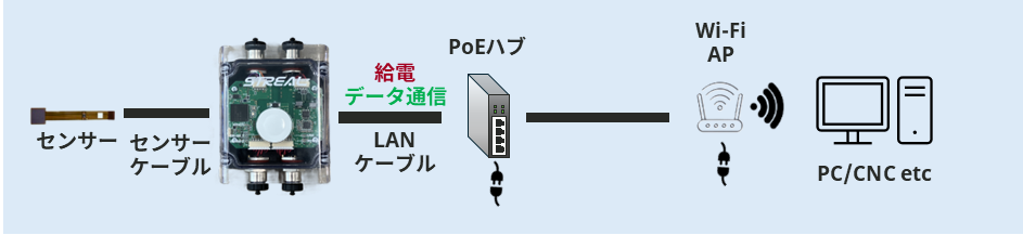 ・PoEから給電し、Wi‑Fiアクセスポイント経由で指定の機器へデータ通信