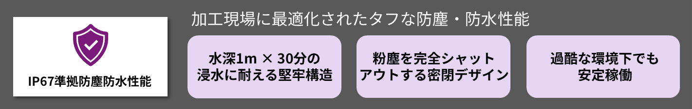 1.粉塵・クーラント環境に対応する防塵防水性能
