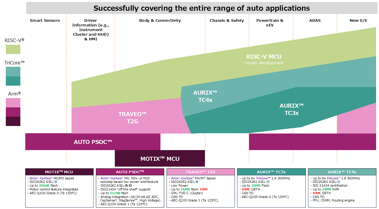 今回ご紹介したMOTIX™ MCUシリーズは、インフィニオン社の持つマイコンファミリーの中においてローエンドからミドルレンジのモーター系アプリケーションをカバーするソリューションになりますが、より機能安全レベルの高いアプリケーションをカバーするAURIX™シリーズや、ミドルレンジからローエンド向けに特にボディー系やクラスター系で多くの実績があるTRAVEO™ T2Gシリーズ、また、静電タッチインターフェースで実績のあるPSOC™シリーズなど、さまざまなシステム要件に対しベストな解決策を提案することができます。