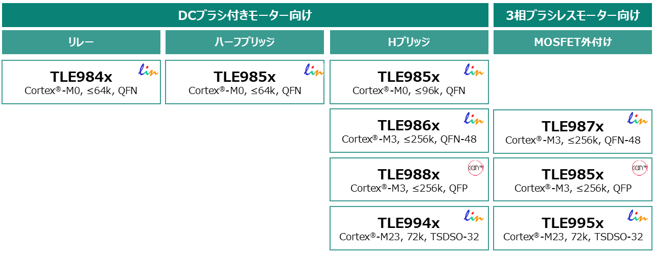 MOTIX™ MCUには、リレー、ハーフブリッジ、Hブリッジ、3相ブリッジ向けにラインナップが分かれており、それぞれ通信もLINとCAN、機能安全のレベルなど、ご要求仕様に沿ったさまざまな製品をご用意しております。