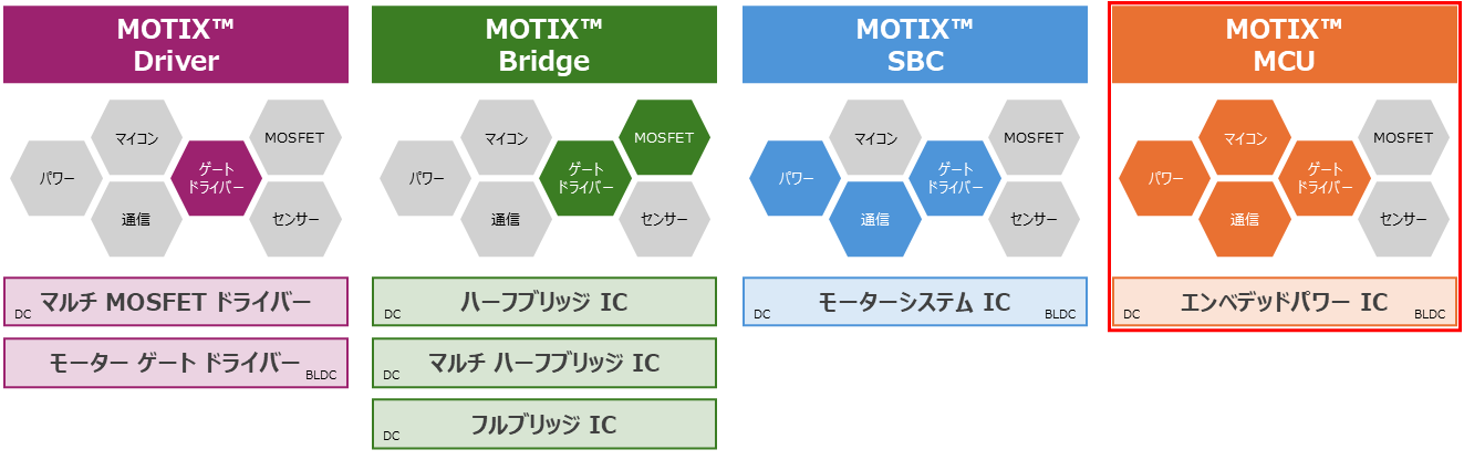 MOTIX™はインフィニオン社のモーター制御ICの製品群の総称で、シンプルなゲートドライバーから、マイコン、MOSFET、電源IC、通信までワンパッケージ化した統合デバイスまで、