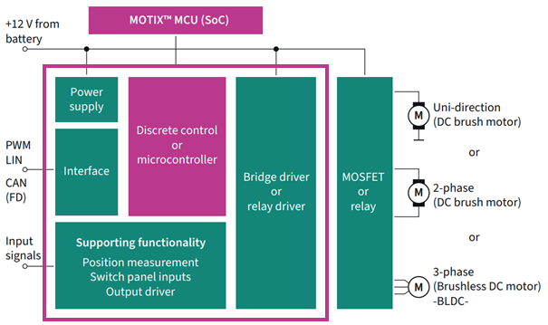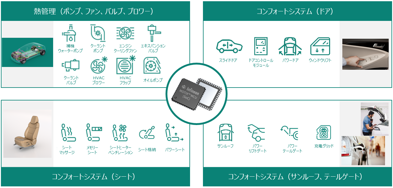 MOTIX™ MCUシリーズは、幅広いレンジのモーター駆動に向いており、熱管理系のアプリケーション(ポンプ、ファン、バルブ、ブロワー)から、車の快適性を向上させるドア周りの