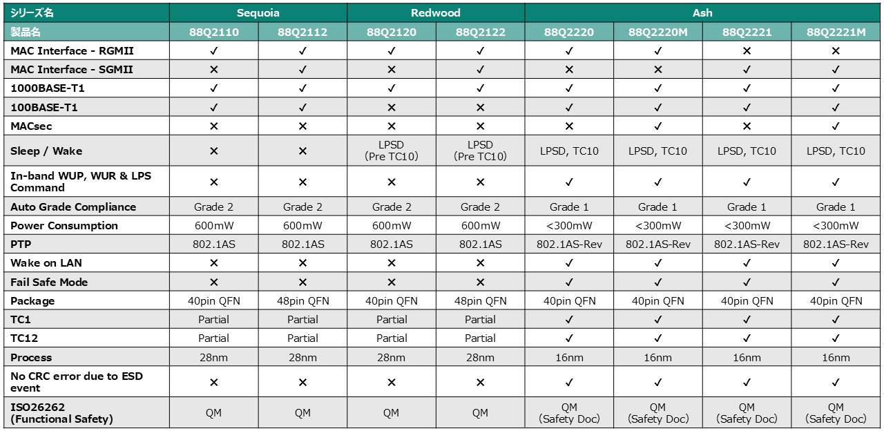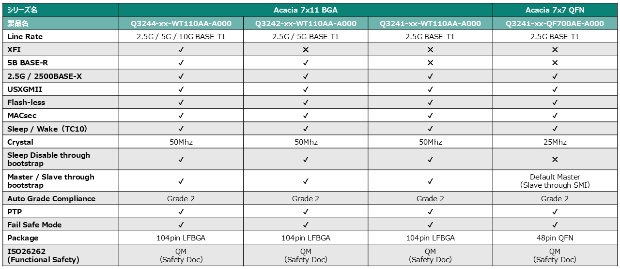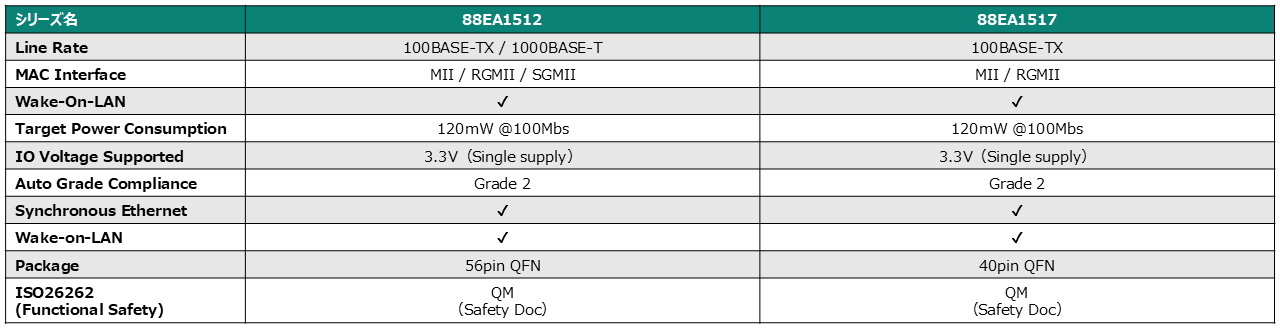 また、大容量センサーデータの集約や中央演算装置との接続を想定し、高速ホストインターフェースをサポートします。MACsecやPTPにも対応し、高速通信とセキュリティ・時間同期を両立するため、将来世代の車載ネットワークを見据えた“基幹インフラ層”を担うラインナップです。
