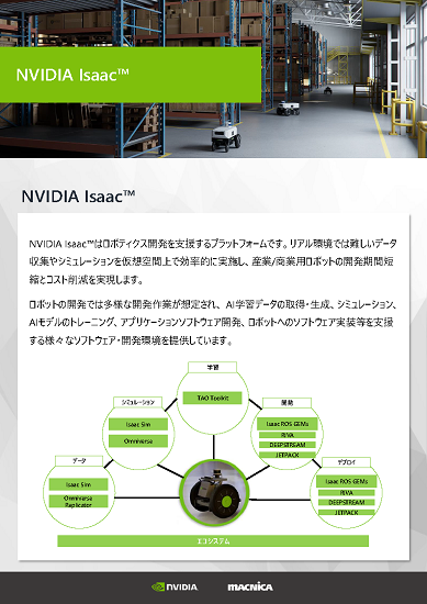 NVIDIA Isaac™は、NVIDIA社提供のロボティクス開発を支援するプラットフォームです。