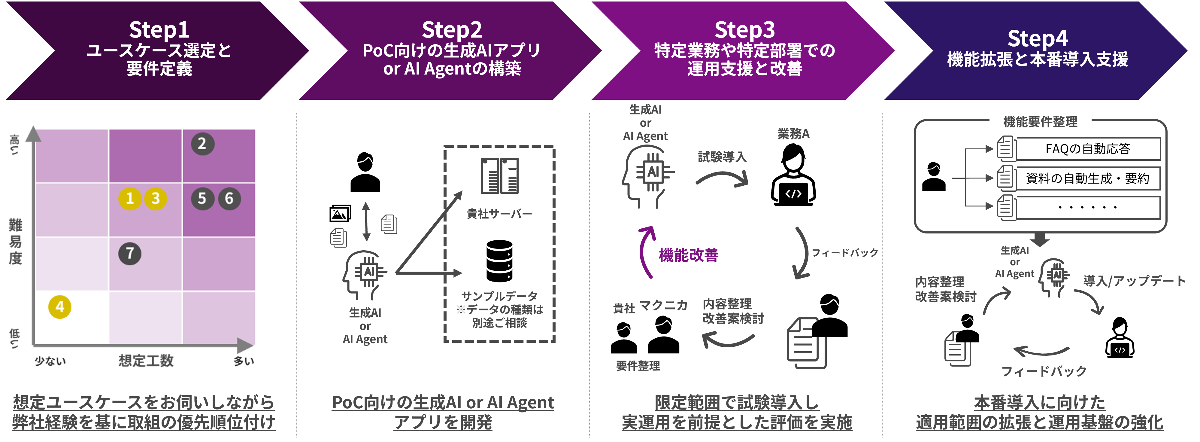 マクニカのAI導入伴走支援は、お客様の事業課題に寄り添いながら、Step 1: ユースケース選定 → Step 2: PoC設計 → Step 3: 実装・評価 → Step 4: 運用・改善までを一気通貫で支援するサービスです。AI活用は、モデル選定やツール導入だけで効果が出るものではありません。業務の前提、データの品質、現場の運用設計、セキュリティ・ガバナンス、ユーザーの体験設計など、複数の要素が組み合わさって初めて価値が生まれます。私たちは、長年にわたり積み重ねてきた、AIで課題解決を目指すお客様とのプロジェクト経験を活かし、貴社の状況に合わせて進め方を設計します。