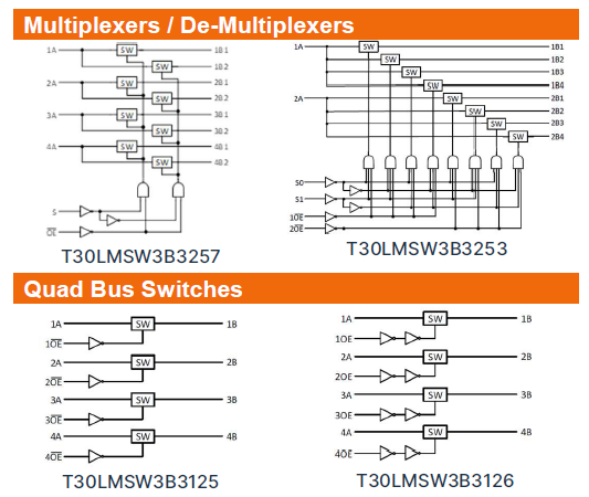 T30LMSWシリーズのバススイッチは、TREOプラットフォームを活用し、低電圧、高帯域幅、低オン抵抗で動作するスイッチを実現しています。