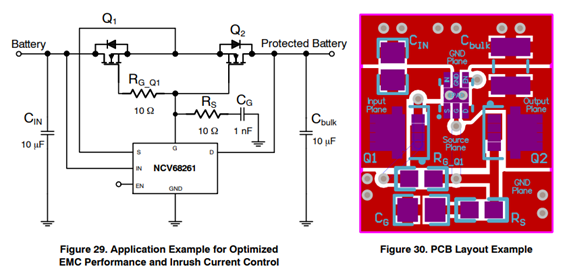 本製品のデータシートに、EMC耐性を向上させるためには、下図に示すアプリケーション例とPCBレイアウトを使用することが推奨されています。