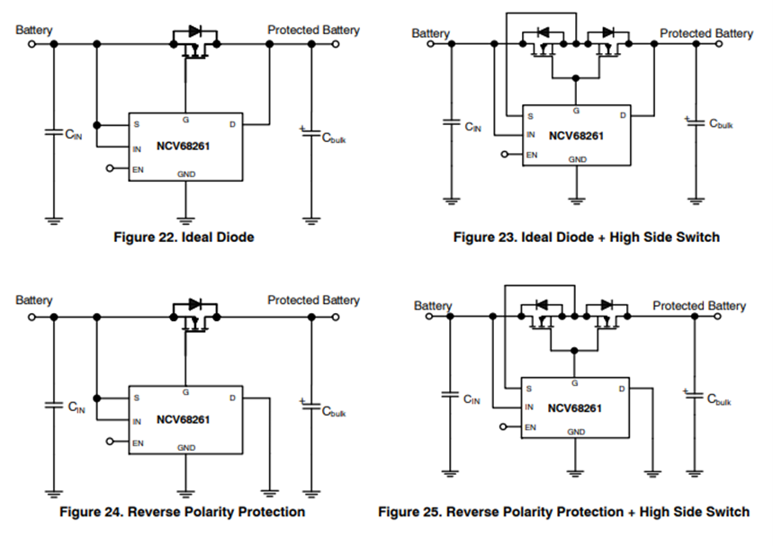 下図の通り、ドレインピンが負荷に接続されている場合、アプリケーションは理想ダイオードモードで動作し、ドレインピンがグラウンドに接続されている場合は、逆極性保護モードで動作します。