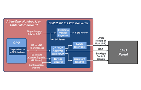 パレードテクノロジーズ社 DisPlayPort™ / eDP to LVDS コンバーター製品は、DisplayPort™ (DP) または Embedded DisplayPort™ (eDP) 出力を備えた GPU と LVDS 入力を受け入れるディスプレイパネルを利用する PC 用に設計された DisplayPort™ から LVDS へのコンバーターです。