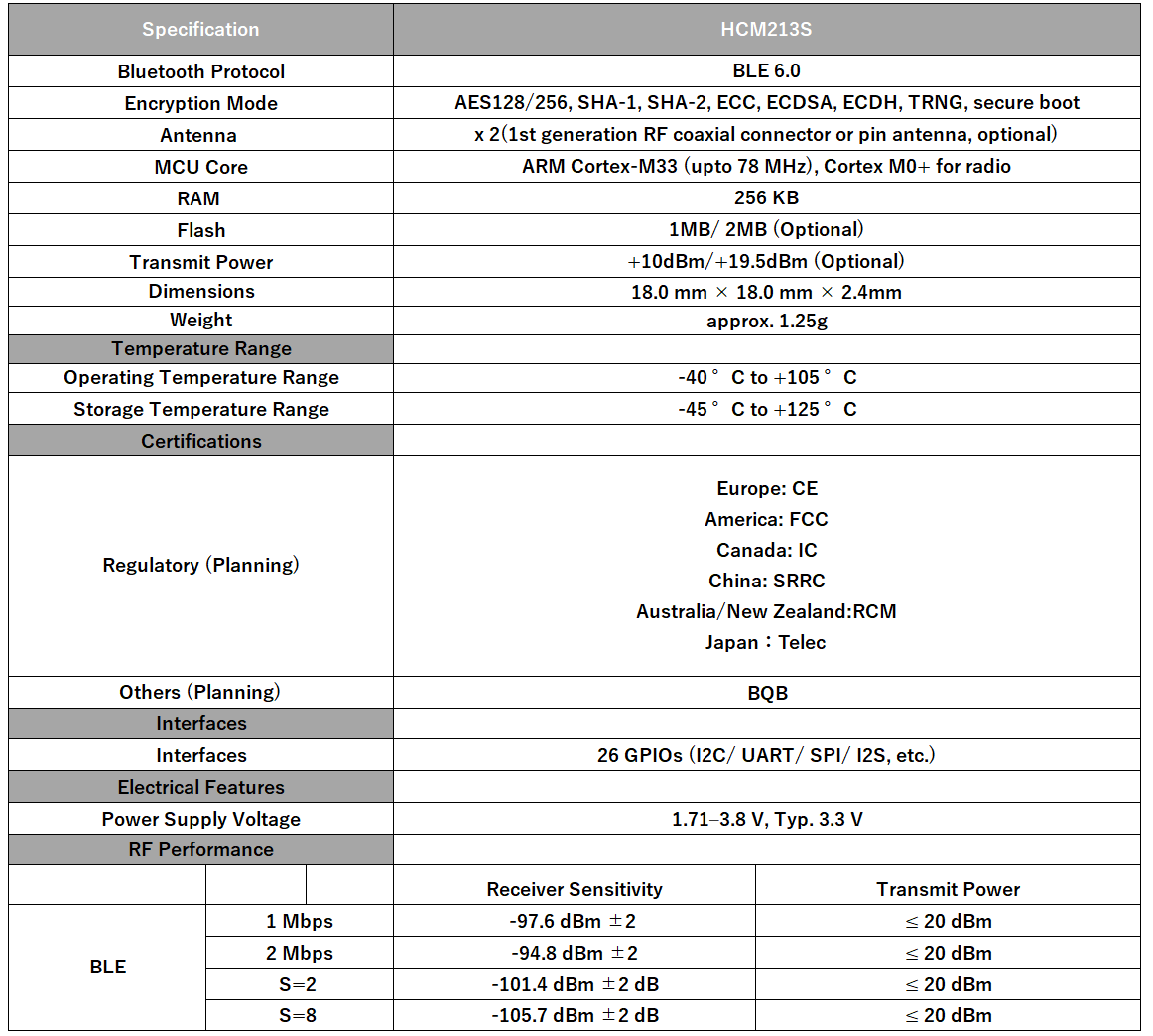 Quectel HCM213S は、Bluetooth® Low Energy 6.0(Channel Sounding対応)および BLEメッシュに対応した、表面実装タイプ(LCC)のMCU内蔵Bluetoothモジュールです。