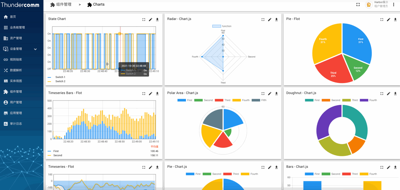 グラフやゲージ、スイッチなどビルトインのウィジェットを活用してデータの可視化やデバイスの制御が可能です。ダッシュボード機能によりユースケースに合わせてお好みのウィジェットを自由に組み合わせて配置することができます。
