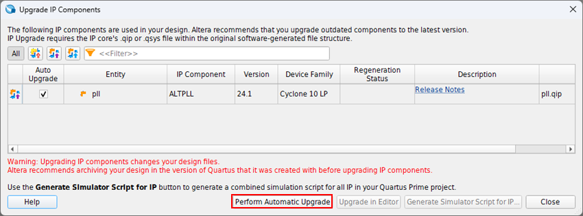 ▼ Stadnard/Lite Edition 25.1 上で、ver.24.1 にて作成済みの ALTPLL を表示させた Upgrade IP Components ウィンドウ