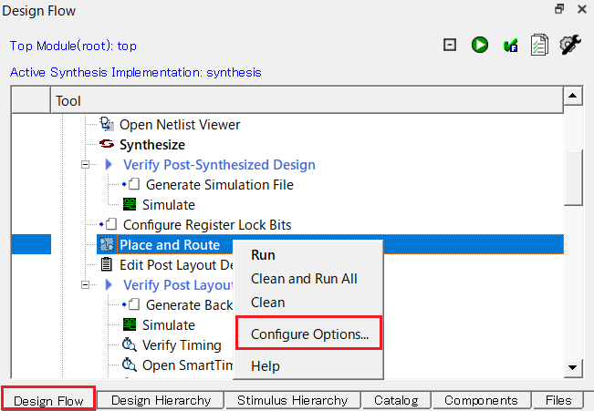 (1) "Place and Route"を右クリック、"Configure Options..."を選択
