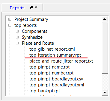 Libero SoC下部のLog、もしくはReport > Place and Route > top_iteration_summary.rptをご確認ください。