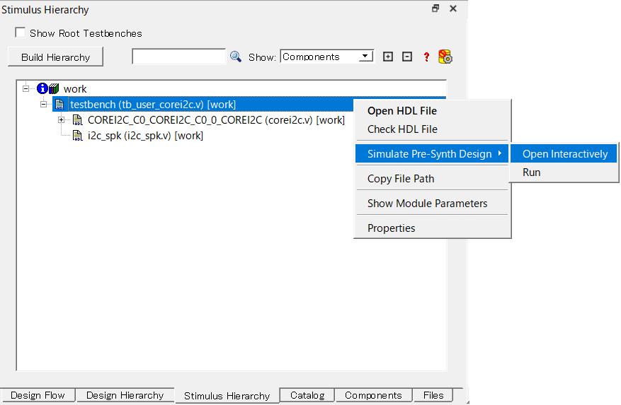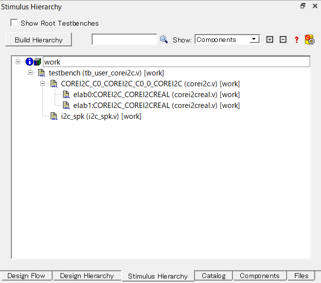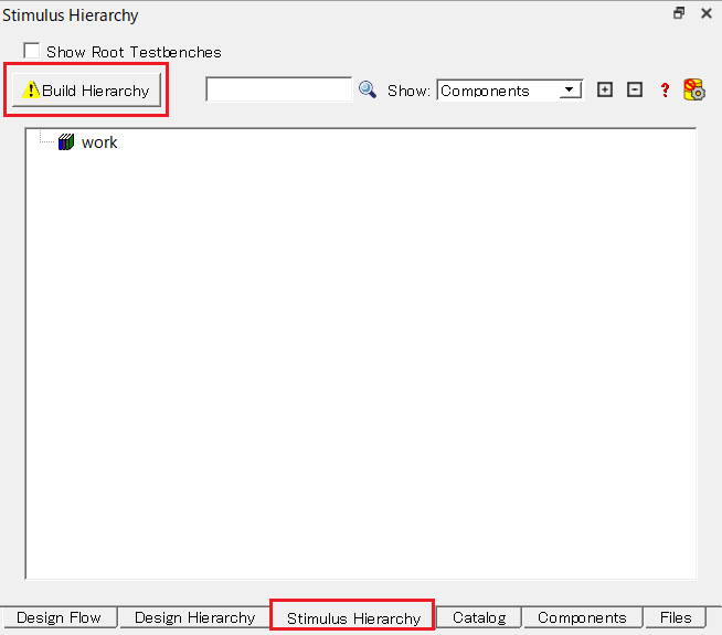 (2) Stimulus Hierarchyタブを開いてBuild Hirarchyを押下、テストベンチが生成されていることを確認します。