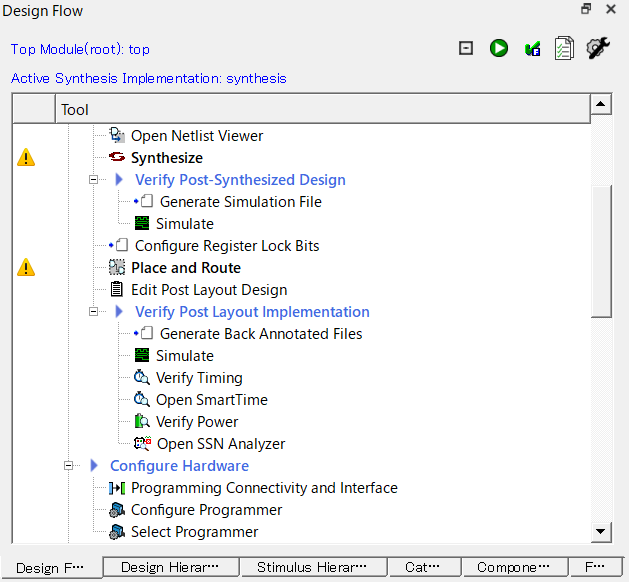 Design Flowにて、SynthesisやPlae and Routeが完了して緑色のチェックマークが表示されている状態のプロジェクトを別のパソコンへ移して開くと、黄色の!マークが表示される。