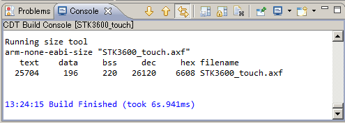下図はSimplicity IDEでサンプルコードをビルドした際の、コンソール表示です。リンカがリンク処理を完了した際に出力される文字列なのですが、セクションという分類毎のサイズ(バイト数)を表わしています。