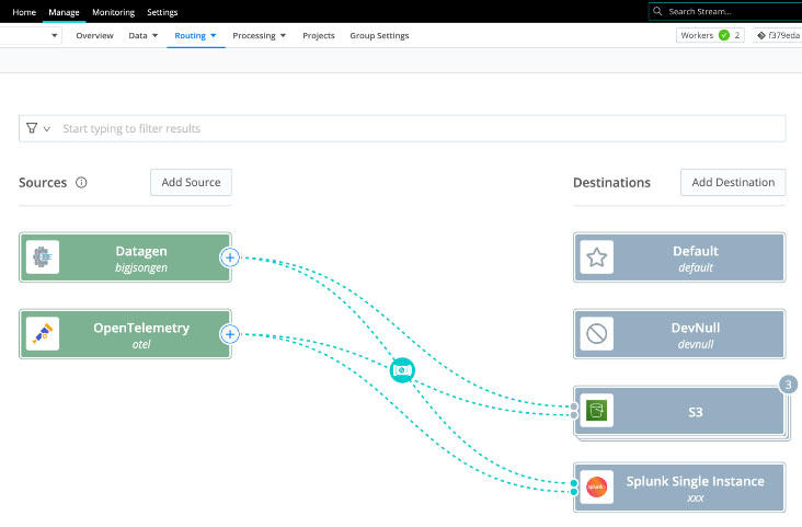 Cribl Streamは、データ送信先とのシームレスな連携も強力にサポートします。データを必要な形式に変換し、適切な送信先にルーティングすることで、効率的なデータフローを実現します。これにより、データの転送や配信がスムーズに行われ、システム全体のパフォーマンスが向上します。必要なデータを必要な場所に送る、を可能にするのがCribl Streamです。