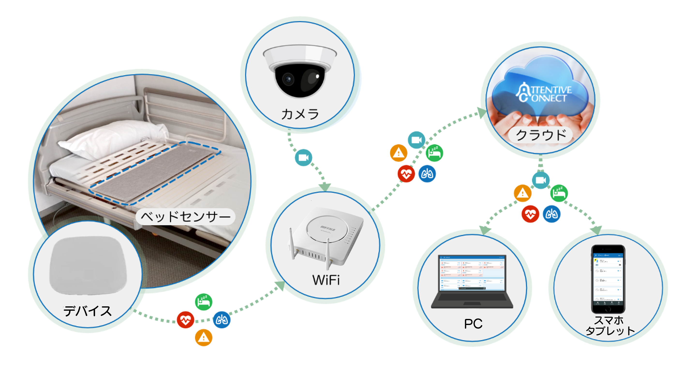 In the healthcare business, we would like to take a step forward from the position of a manufacturer's agent and build a platform that integrates the products and services we provide as a self-developed cloud service, contributing to the spread of IoT technology in the nursing care field. increase. The vital sensors to be provided will adopt devices from manufacturers with cutting-edge technology, but we have developed AttentiveConnect with the aim of making it a service that can be used from the day it is introduced, even if the user is unfamiliar with IT equipment. Did. For integrators who provide systems to nursing care providers, we have released an API so that they can smoothly link with the IoT sensors the Company handle.