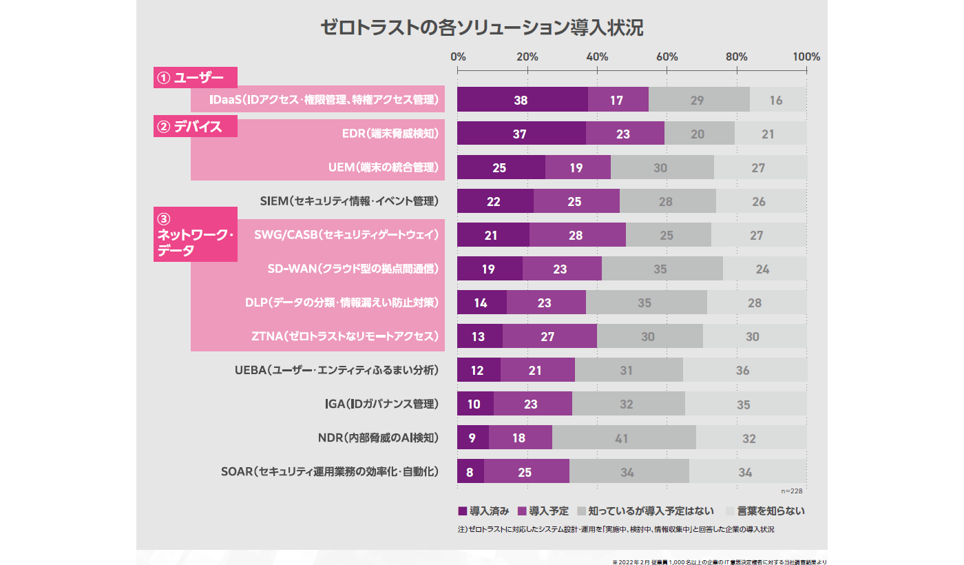弊社が実施した従業員数 1000人以上の企業の IT導入の228名への調査において、「ゼロトラストに対応したシステム設計・運用を実施中、検討中、情報収集中」と答えた方の中で55%がIDaaSを導入済み・導入予定、60%がEDRを導入済み・導入予定と回答しているのに対して、SASEやSSE 領域の代表的なソリューションであるSWG・CASB は50%が導入済み・導入予定と答えています。