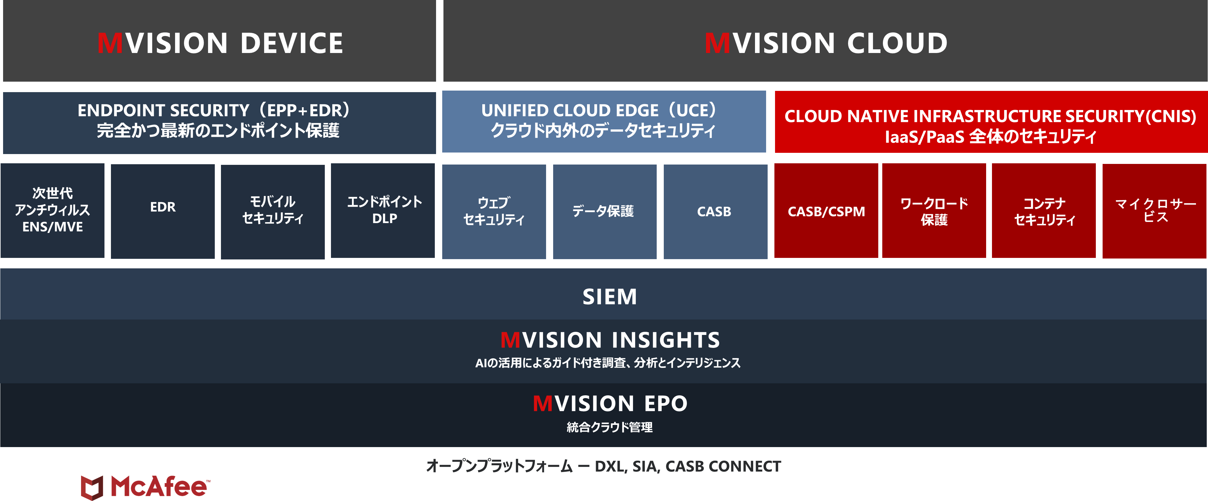 - McAfee MVISIONはお客様社内のデバイスからクラウドまでのデジタル領域全体を可視化し、 セキュリティを一元管理する新しいクラウドベースの製品群です
