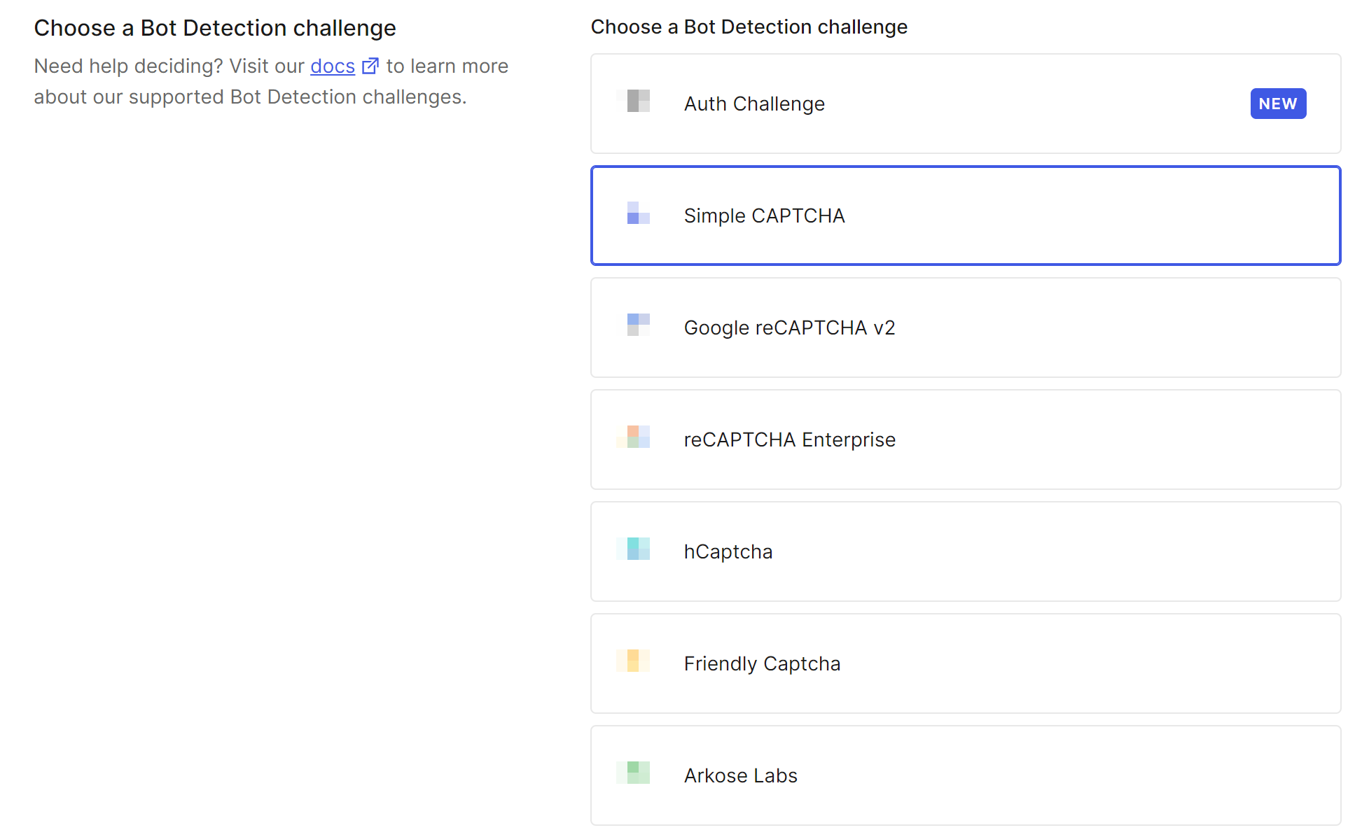 You can use Auth challenge (※1) and Simple CAPTCHA (※2) provided by Auth0, or Google reCAPTCHA v2, reCAPTCHA enterprise, hCaptcha, Friendly Captcha, and Arkose Labs provided by other vendors (separate registration with the vendor is required, and site key and secret, etc. must be set).