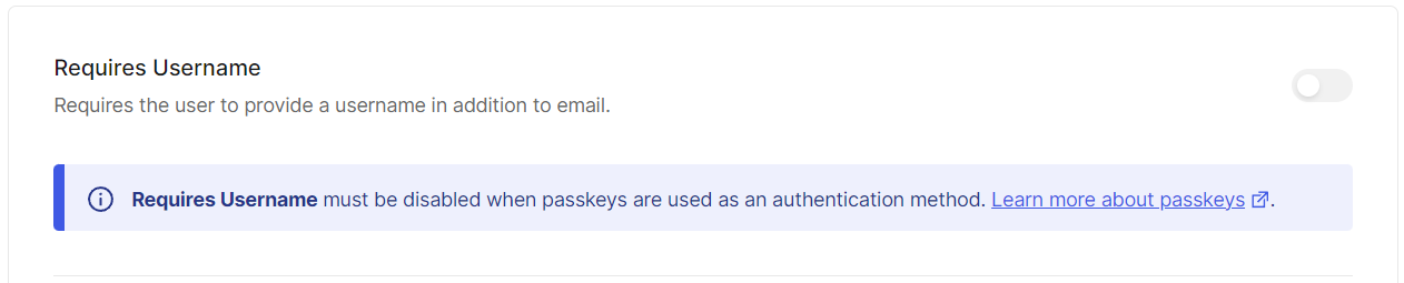 [Requires Username]を有効化すると、メールアドレスに加えて、ログイン時にユーザ名が要求されます。パスキー認証を有効化する場合は、[Requires Username]を無効化する必要があります。