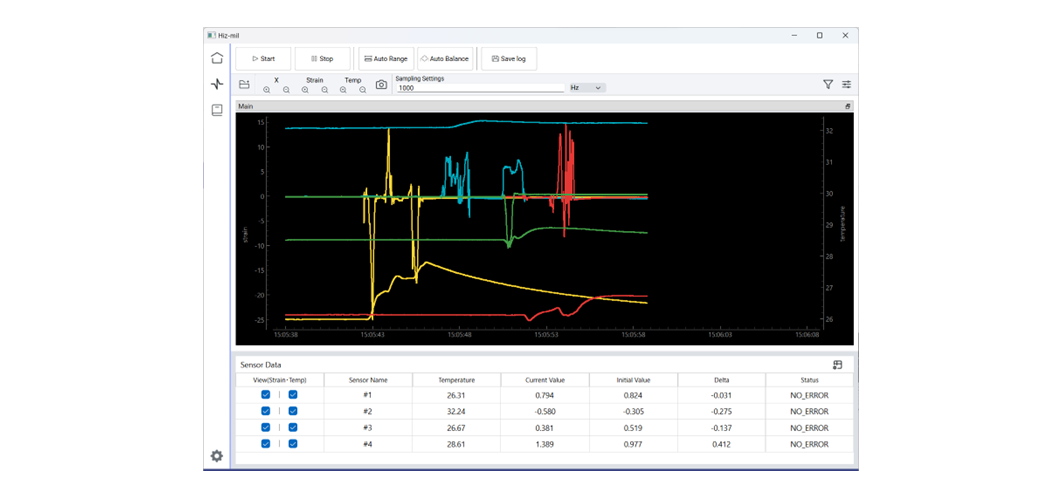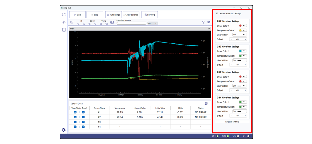 ひずみ・温度それぞれの波形色、線の太さ、表示オフセットを個別に調整できるため、複数センサーを同時に計測する場合でも、高い視認性を確保できます。評価内容や測定条件に応じた、最適な波形表示環境を構築可能です。