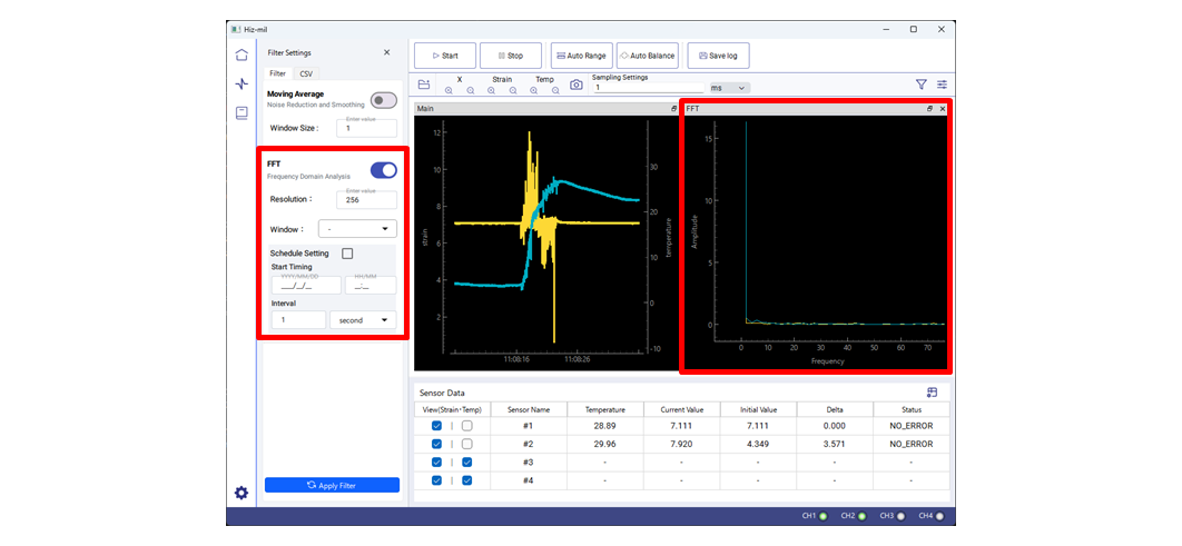 取得したデータに対して、移動平均、FFT解析、標準偏差といった解析機能を搭載しています。用途に応じてリアルタイム解析と記録データ解析を使い分けることで、評価や検証を効率的に行うことが可能です。