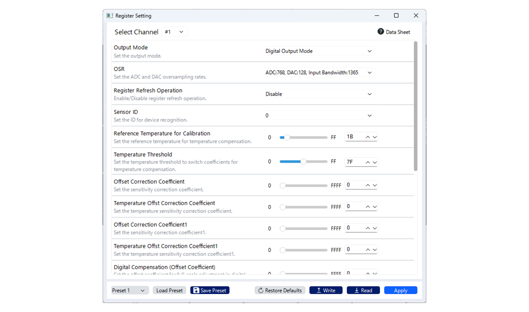 従来版で評価されたレジスタ設定機能を踏襲し、さらに本ツールではユーザーがより使いやすいようスライダーやスピンボックスによる数値入力を可能にしました。これらの機能により、STREALの各種レジスタをGUI上から設定・読み出しできます。