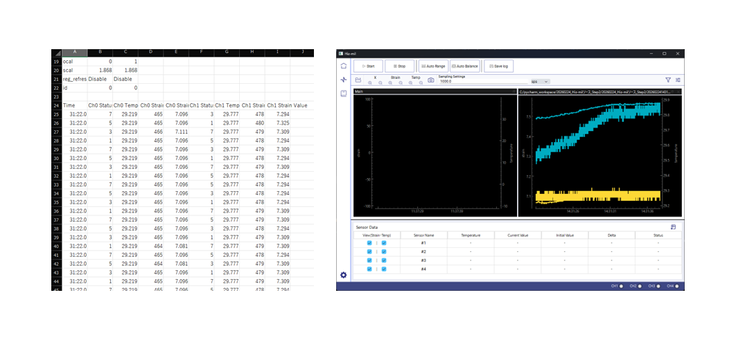 計測画面では、センサーから取得したひずみ・温度データをリアルタイムで波形表示します。