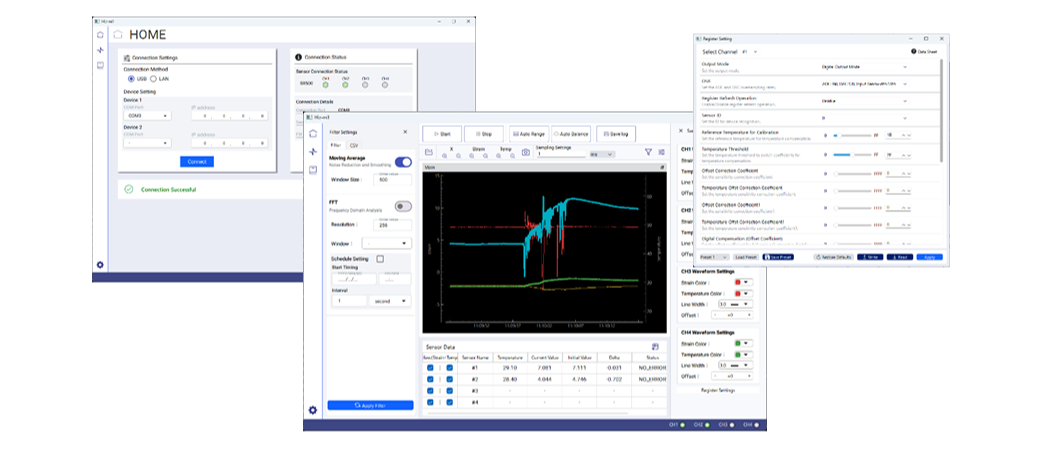 本ツールは、半導体ひずみセンサーSTREAL向けモニタリングユニット「NEシリーズ」と接続し、ひずみ・温度データの計測、可視化、解析を行うための評価・モニタリング用アプリです。