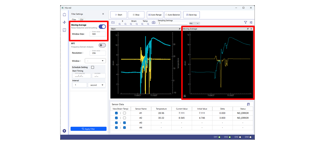 移動平均機能では、計測中のひずみデータに対してリアルタイムで解析を適用できます。