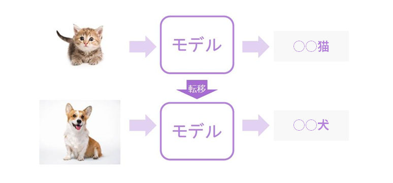 具体的には、犬の種類を識別するモデルを実現する場合に、猫の種類を識別する学習済モデルを活用するといった例が考えられます。顔の形、四本足の形状などの動物の共通的な特徴の学習結果を応用でき、追加で犬種の区別に必要な特有の違いを再学習することで、効率よくモデルを実現できる可能性があります。
