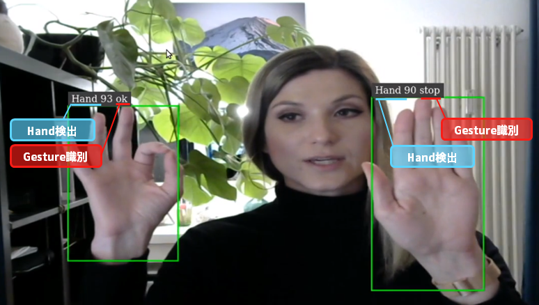 こちらの実行結果では、推論処理1により緑のバウンディングボックスで両手を検出しており、推論処理2により右手はOk、左手はStopと識別できていることが確認できております。第1話では人物検知アプリケーションの実行例をご紹介しましたが、今回は手の認識を行った後、そのジェスチャーの意味を判定するといったより高度な推論処理が可能となっております。NVIDIA TAO TOOLKITを使用することで、ネットワークモデルを含む複数のモデルを使用した推論が容易に構成できます。