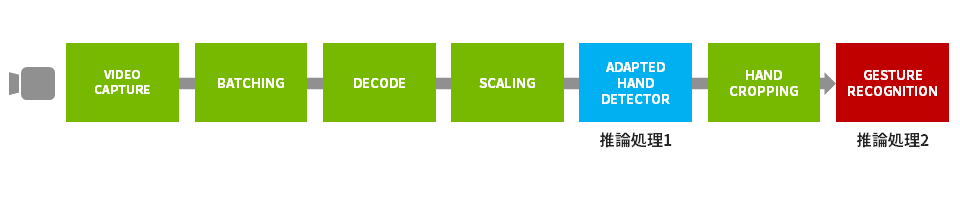 Jetsonに接続されたカメラにて撮影された映像ストリームへ、以下の2段階の推論処理を組み込こんだアプリケーションの実装例です。