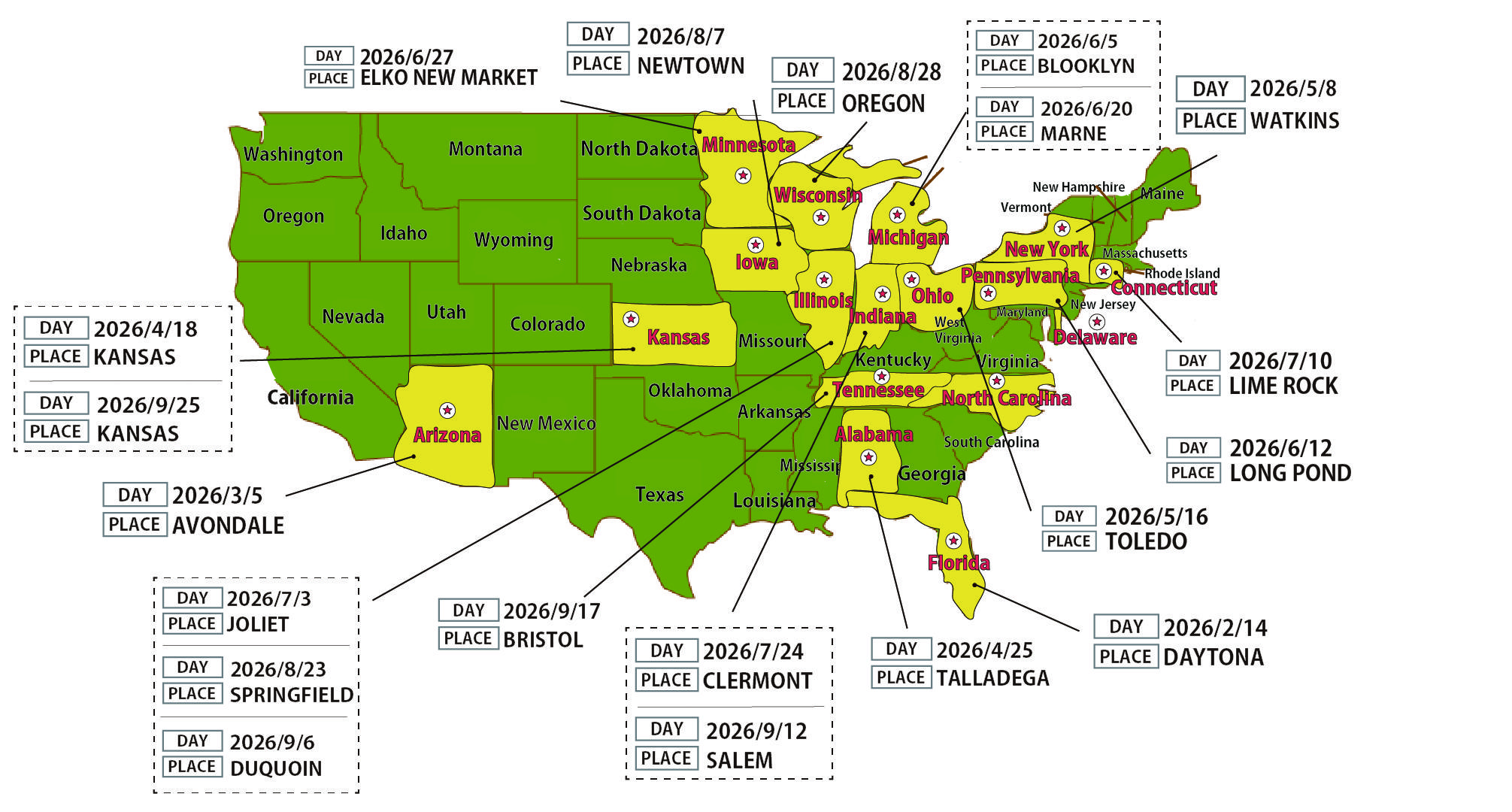 | 7 | 2026/6/5 | - | MICHIGAN SPEEDWAY | BROOKLYN,MI | ARCA | OVAL | |