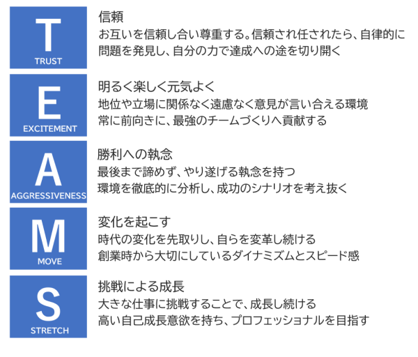 お互いを信頼し尊重すること、地位や立場に関係なく遠慮なく意見が言い合える環境をつくっていくこと、大きな仕事に挑戦し成長し続けることなど、一人ひとりを大切にしつつ、高いチームワークを実現することを目指しています。