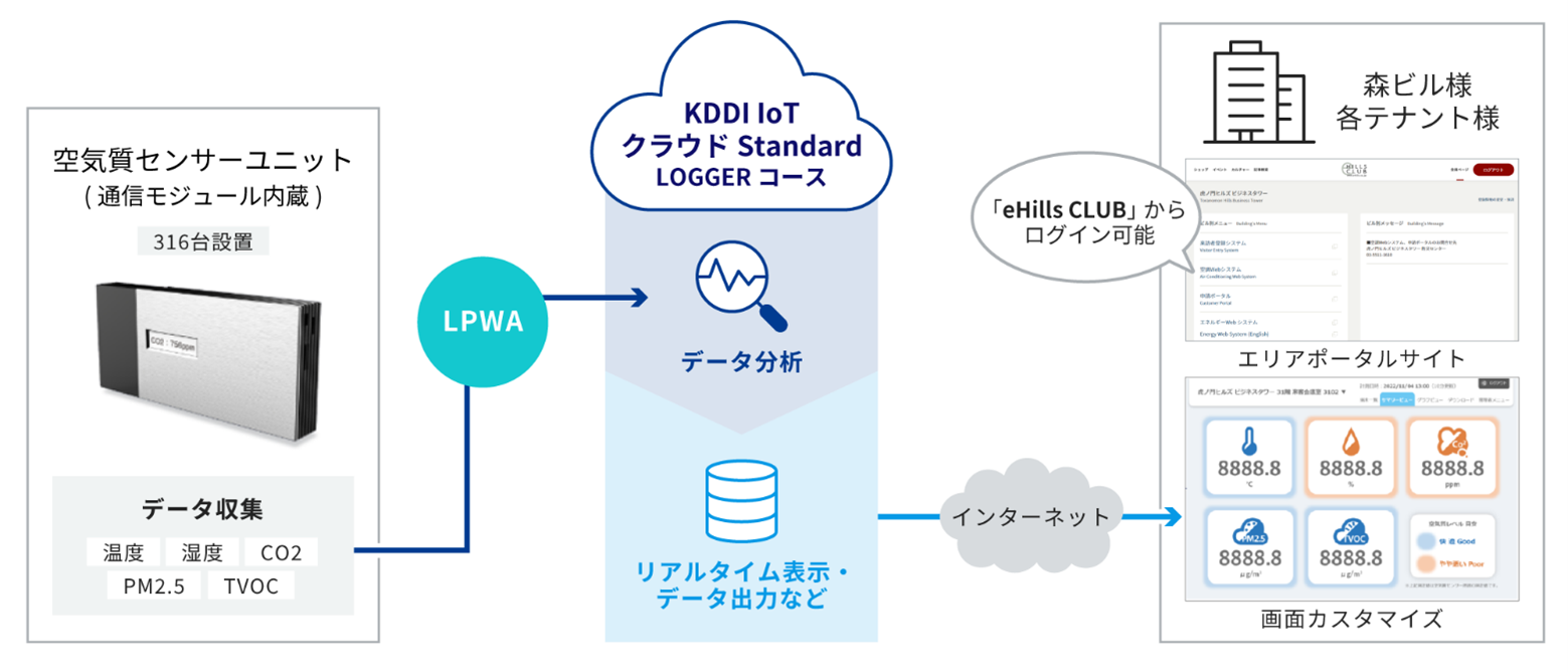 KDDI株式会社(本社:東京都千代田区、代表取締役社長CEO:髙橋 誠、以下 KDDI)と株式会社マクニカ(本社:横浜市港北区、代表取締役社長:原 一将、以下 マクニカ)は、2024年5月27日、森ビル株式会社(本社:東京都港区、代表取締役社長:辻󠄀 慎吾、以下 森ビル)が運営する、「Green & Wellness」をテーマとした複合施設 麻布台ヒルズのオフィス空間に、空気質をリアルタイムでモニタリングできるソリューション(以下 本ソリューション)を提供しました。本ソリューションを利用することで、空気中に含まれるCO2やPM2.5の濃度などの測定結果をモニターで常時監視することができ、ビル利用者はデータに基づいた環境整備が可能になります。
